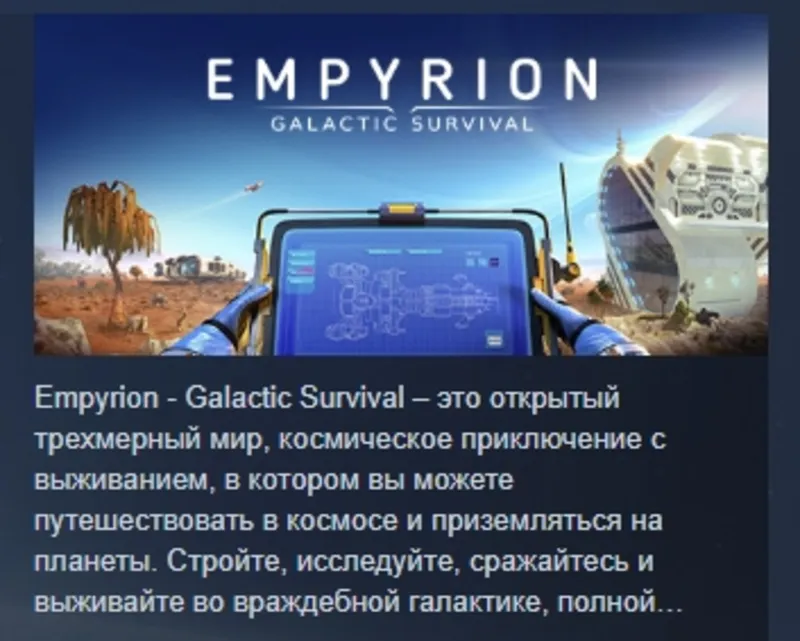 Empyrion - Galactic Survival – это приключение с выживанием в открытом мире космической песочницы. Создавайте мощные корабли, могучие космические станции и обширные планетные поселения, чтобы исследовать, завоевывать или эксплуатировать различные планеты и открывать тайны Empyrion! Сражайтесь с людьми, инопланетянами, планетарными и биологическими опасностями и выживайте во враждебной галактике, полной скрытых опасностей. Играйте один или объединитесь с друзьями, заводите новые знакомства, создавайте альянсы или объявляйте войны, чтобы завоевать солнечную систему.