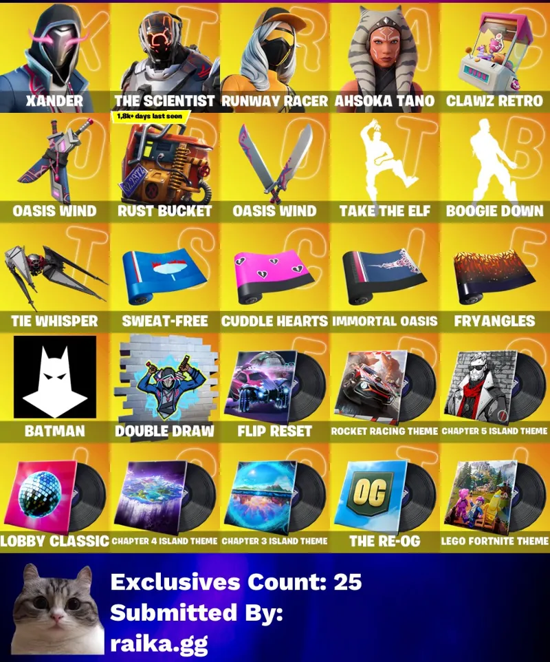 • После покупки вы получаете аккаунт Fortnite с 202 скинами. Данные предоставляются от игры + данные от почты. На аккаунте будет задержка на смену почты.