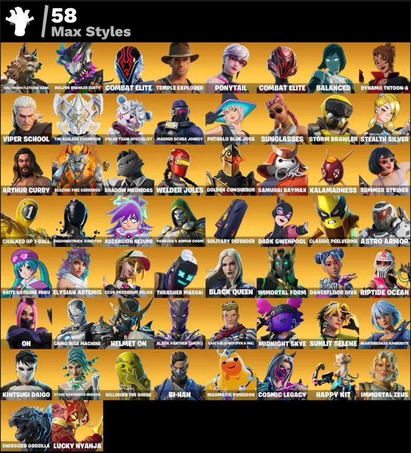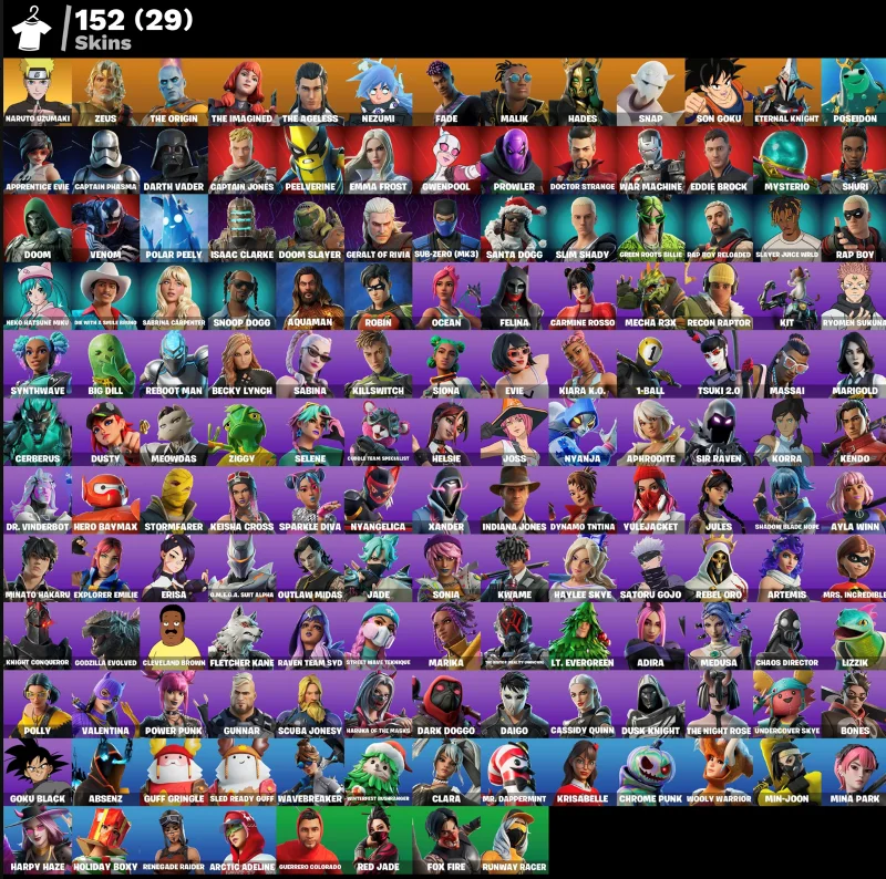 152 скина | Renegade Raider | Naruto Uzumaki | Zeus | The Origin | The Imagined | The Ageless | Nezumi | Fade | Malik | Hades | Snap | Son Goku | 550 VB