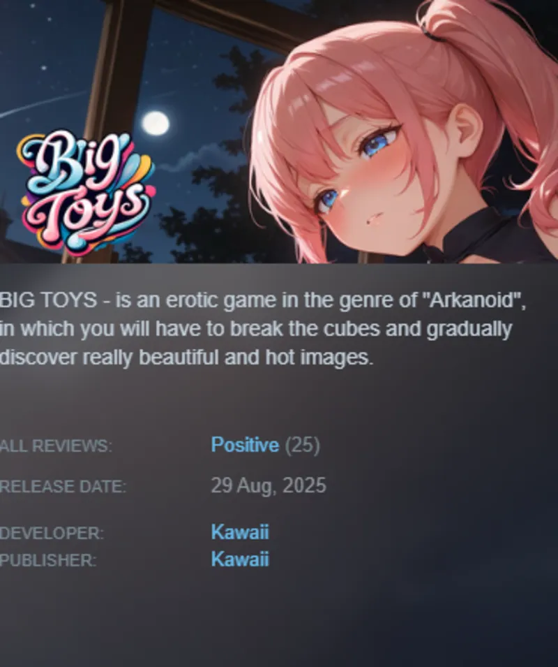 BIG TOYS — это эротическая игра в жанре «Арканоид», в которой вам предстоит разбивать кубики и постепенно открывать для себя действительно красивые и пикантные изображения.