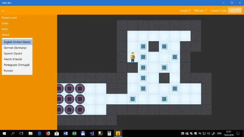 Игра проигрывается на доске квадратов, где каждая квадратная клетка представляет собой пол или стену. Некоторые полные квадраты содержат коробки, а некоторые полные квадраты помечены как хранилища. Игрок ограничен доской и может перемещаться горизонтально или вертикально на пустые квадраты (никогда через стены или коробки). Игрок также может переместиться в коробку, которая толкает ее в квадрат дальше. Коробки не могут быть толкнуты в другие коробки или стены, и они не могут быть вытянуты. Количество коробок равно количеству хранилищ. Головоломка решается, когда все коробки находятся в хранилищах.