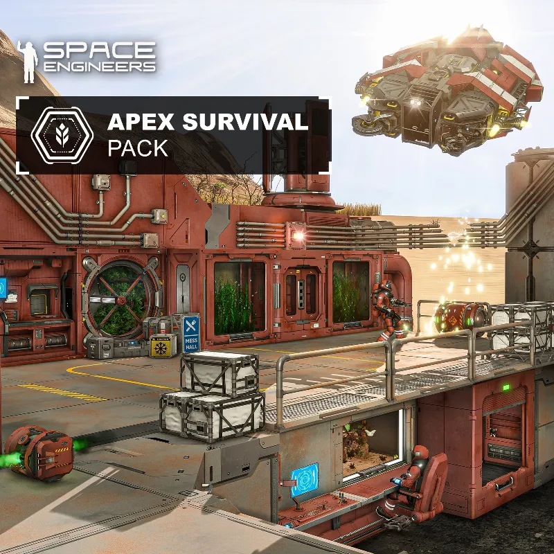 Space Engineers: Apex Survival Pack предлагает коллекцию survival-themed cosmetic blocks, включая промышленный Welder Type II, rugged Grinder Type II, bucket-scoop Drill Type II и многое другое. Обеспечьте устойчивость с Half Oxygen Farm и Half Algae Farm или оживите вашу базу с Inset Terrarium Desert, Inset Terrarium Forest и вращающимся Inset Planter. Экипируйтесь vertical Survival Kit Type II и sleek Ore Detector Type II. Организуйте ресурсы с Storage Bin Set, добавьте реализма с twisted industrial Conduits и отметьте опасности bold Warning Signs. Идеально для строительства immersive survival outposts и frontier colonies. Этот контент не “pay to win”, и владелец пакета не имеет преимущества над другими игроками. Если вы решите не покупать Apex Survival Pack, но хотите играть с друзьями или другими игроками, которые его купили, вы всё равно сможете присоединиться к multiplayer game или server и участвовать. Этот пакет включает: Welder Type II (1 block, L grid + 1 block, S grid) Сварщик, вдохновлённый производственной линией, добавляющий bold, mechanical aesthetic к вашим engineering projects. Grinder Type II (1 block, L grid + 1 block, S grid) Пусть ваша salvage rig разрушает grids со стилем с этим heavy industrial grinder! Drill Type II (1 block, L grid + 1 block, S grid) Bucket-scoop стильная дрель для heavy duty excavation operations. Half Oxygen Farm (1 block, L grid) Разработана для функциональности и стиля, эта Oxygen Farm обеспечивает breathable air и служит decorative wallpiece. Half Algae Farm (1 block, L grid) Двойные glass water reservoirs с большими массами alien kelp, которые можно собирать и перерабатывать в foodstuffs. Inset Terrarium Desert (1 block, L grid) Маленький кусочек Pertam, который вы несёте с собой в приключениях. Содержит multiple insect species, подходящие для harsh environments. Inset Terrarium Forest (1 block, L grid) Самостоятельный habitat, напоминающий lush forest regions на Earthlike планете, полный diverse и vibrant форм жизни. Inset Planter (1 block, L grid) Decorative planter bed, закреплённый на медленно вращающемся circular frame, идеален для compact spaces и low gravity environments. Survival Kit Type II (1 block, L grid + 1 block, S grid) Ключ к выживанию на harsh alien worlds — правильное оборудование. Этот vertically oriented Survival Kit — всё, что нужно для foothold в новой, dangerous region. Ore Detector Type II (1 block, L grid + 1 block, S grid) Сканируйте поверхность alien worlds со стилем! Storage Bin Set (3 blocks, L grid) Flexible fabric containers для bulk goods, arranged в loose stacks или firmly strapped к pallets для transport. Conduit Set (11 blocks, L grid) Twisting runs of electrical conduits, идеальны для добавления visual complexity и industrial aesthetic к вашим builds. Warning Signs (3 blocks, L grid + 3 blocks, S grid) Не будьте caugh