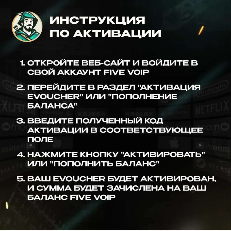✅ Скидка 8% при оплате криптовалютой🎙️ Five VoIP eVoucher — это электронный ваучер для предоплаты голосовой связи через интернет. Подходит для оплаты звонков, подписок и VoIP-сервисов. Отличное решение для тех, кто ценит контроль расходов и предпочитает гибкие способы связи.📡 Преимущества Five VoIP eVoucher: