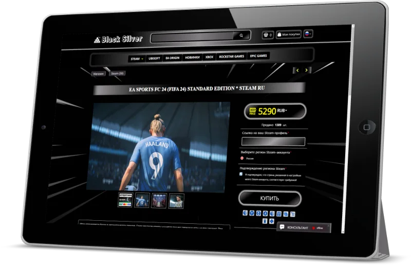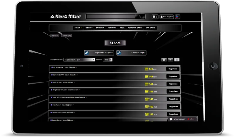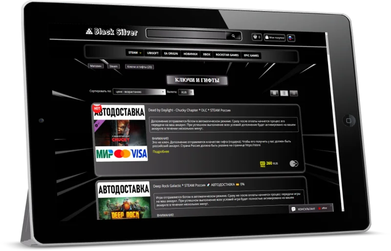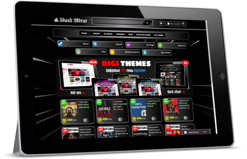 "Black Silver" — Это эксклюзивная индивидуальная CSS — Тема, созданная для каталога магазина Digiseller и рассчитана для создания проектов под продажу цифровых, игровых ценностей, таких как: цифровые ключи, аккаунты различные пин-коды к популярным игровым платформам.