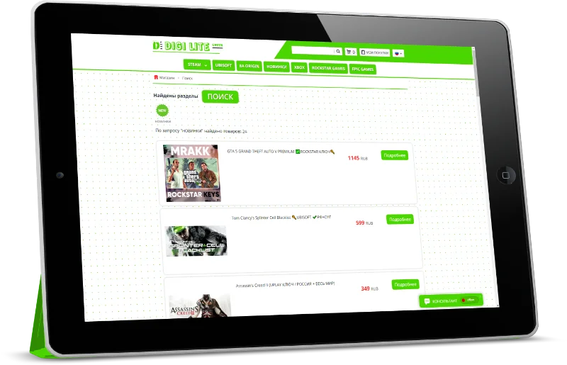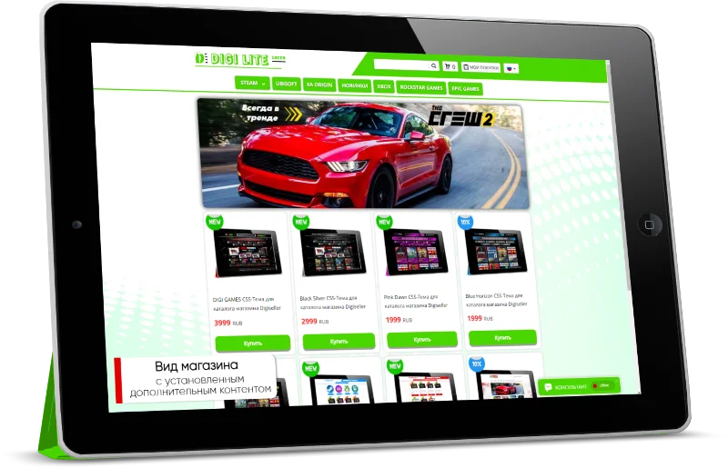 "DIGI LITE Green" — Это индивидуальная CSS — Тема, созданная для каталога магазина Digiseller и рассчитана для создания проектов под продажу цифровых, игровых ценностей, таких как: цифровые ключи, аккаунты различные пин-коды к популярным игровым платформам.