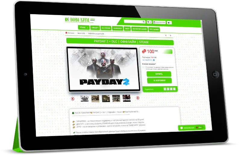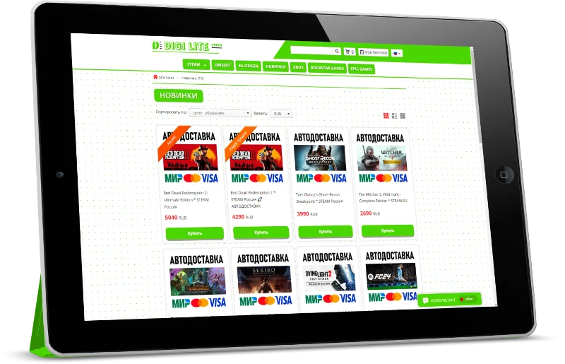"DIGI LITE Green" — Это индивидуальная CSS — Тема, созданная для каталога магазина Digiseller и рассчитана для создания проектов под продажу цифровых, игровых ценностей, таких как: цифровые ключи, аккаунты различные пин-коды к популярным игровым платформам.