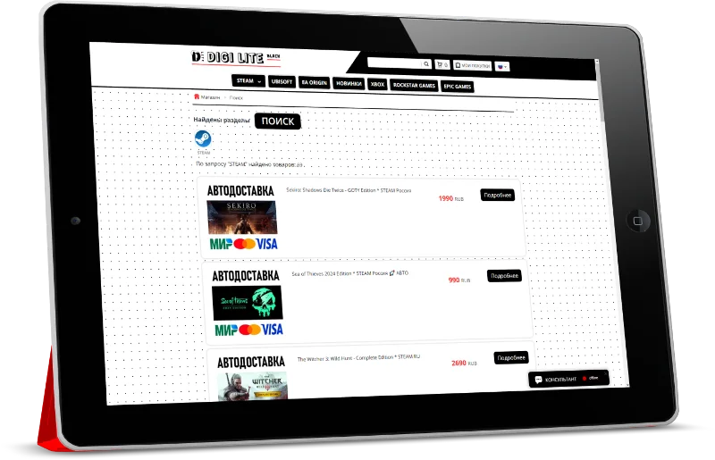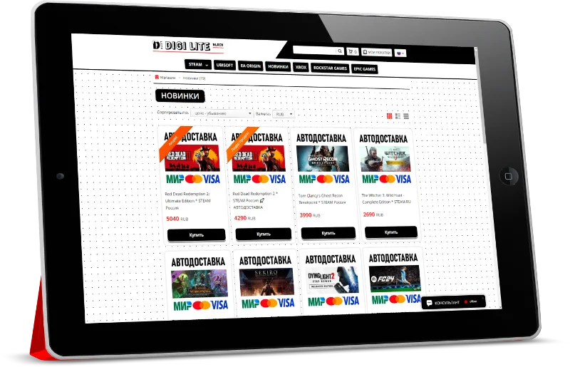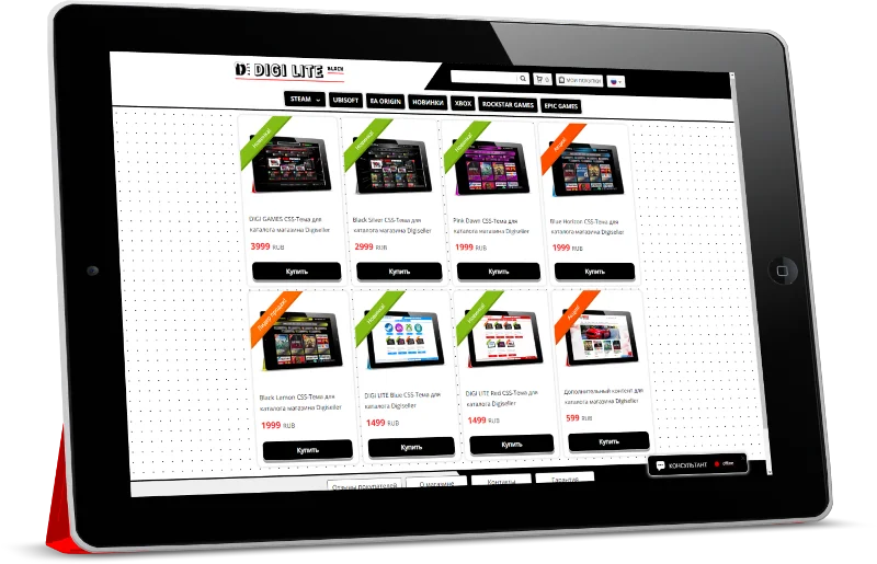 "DIGI LITE Black" — Это индивидуальная CSS — Тема, созданная для каталога магазина Digiseller и рассчитана для создания проектов под продажу цифровых, игровых ценностей, таких как: цифровые ключи, аккаунты различные пин-коды к популярным игровым платформам.