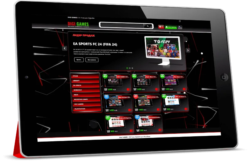 “DIGI GAMES” — Это индивидуальная CSS — Тема, созданная для каталога магазина Digiseller и рассчитана для создания проектов под продажу цифровых, игровых ценностей, таких как: цифровые ключи, аккаунты различные пин-коды к популярным игровым платформам таким как: Steam, EA, Ubisoft, Xbox и многих других, а также используя виджеты и плагины отлично впишется в интерьер Вашего собственного сайта на WordPress.